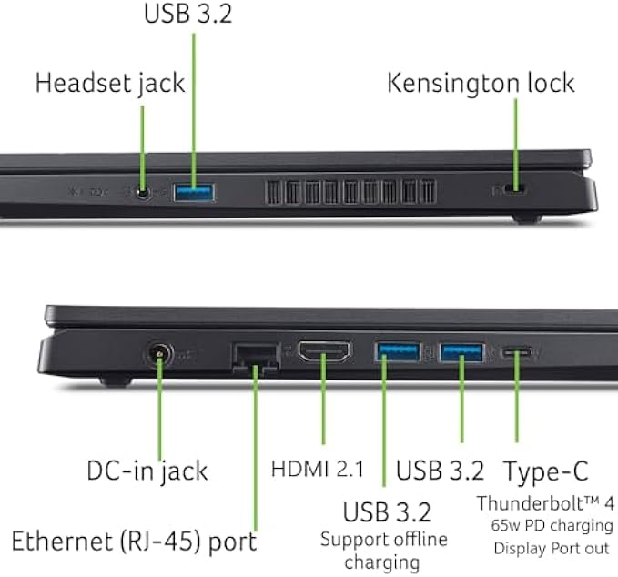 • Ports For All Your Accessories: 1 - USB Type-C Port USB 3.2 Gen 2 (up to 10 Gbps) DisplayPort over USB Type-C, Thunderbolt 4 & USB Charging, 1 - USB 3.2 Gen 2 Port (Featuring Power-off Charging), 2 - USB 3.2 Gen 1 ports, 1 - HDMI 2.1 Port with HDCP support, 1 - Headphone/Speaker/Line-out Jack, 1 - Ethernet (RJ-45), DC-in for AC adapter