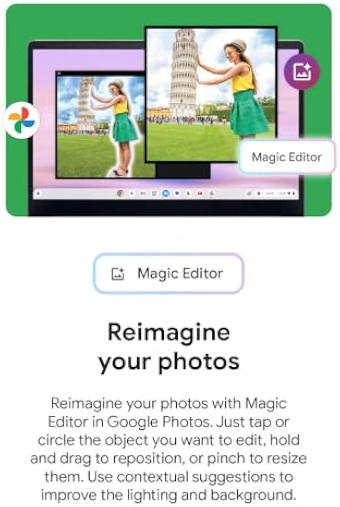 • Runs ChromeOS, with Google AI: The fast, secure operating system built by Google comes with AI tools to make hard work feel easy. Write like a pro, design unique backgrounds, and reimagine photos with generative AI.