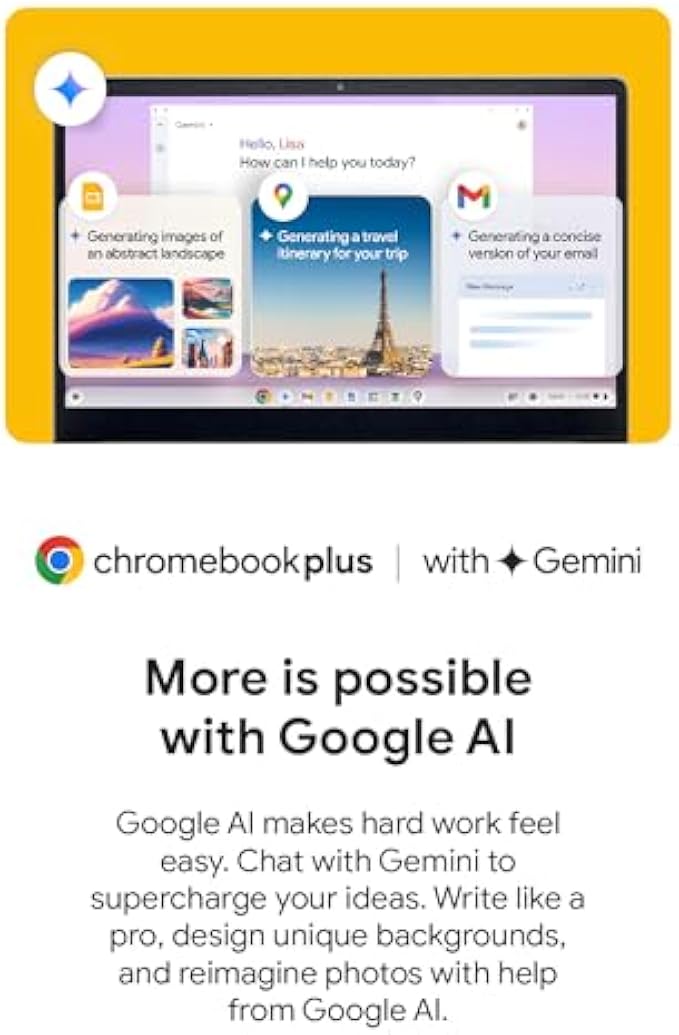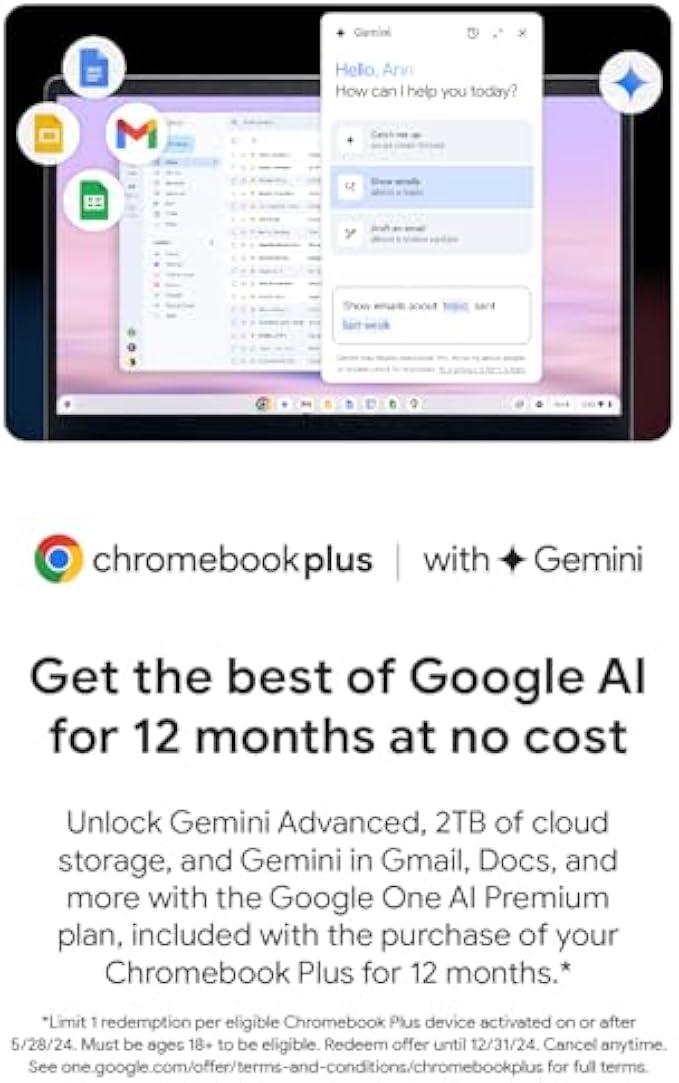 • Get the best of Google AI and 2 TB of storage for 12 months with a new Chromebook Plus: Chromebook Plus comes with 12 months of the Google One AI Premium plan including Gemini Advanced and Gemini in Gmail, Docs, and more to boost your productivity and creativity. Plus, you get 2 TB of secure cloud storage from Google One