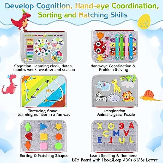 • [PLAY WHILE LEARNING] - Keep your toddlers entertained while they develop essential skills like dressing at their own pace, improving fine motor skills and finger dexterity. The Octopus button page help improve hand eye coordination. Clock, calendar and season weather page is for cognitive skill. Shape matching page and fun jigsaw puzzle improve recognition and imagination. Toddler can learn spelling and numbers through the hook&loop letters board and interesting number threading game.