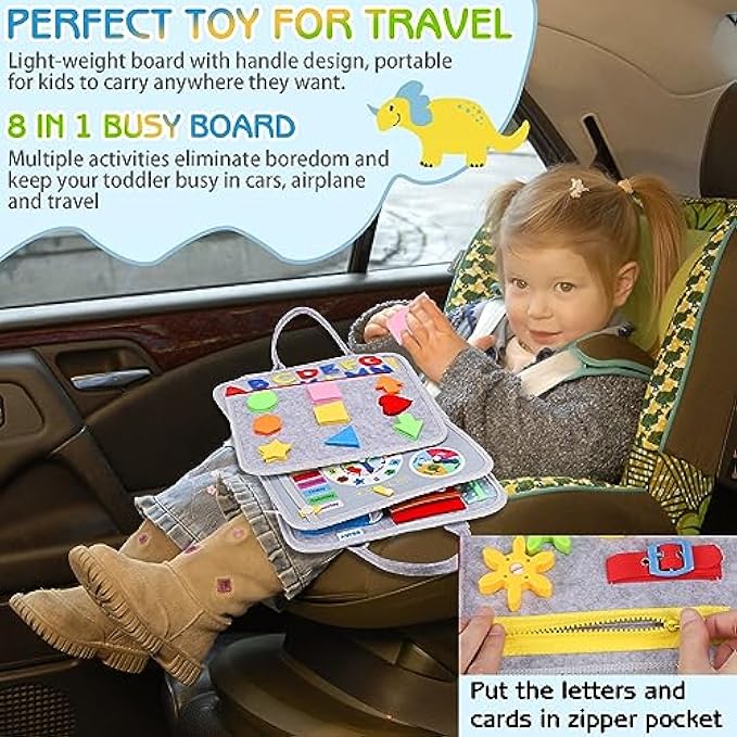 • [SOFT TOYS & PORTABLE FOR TRAVEL]: Our sensory toys for toddlers is made of toxic-free soft fabrics and felt with no hard corners, safe for your little toddlers to play. Busy board with handle, portable for toddlers to carry and flexible to fit in most diaper or school bags. Great toddler activities sensory board to keep them occupied while on car, airplane, travel or settings needing quiet.