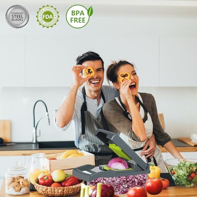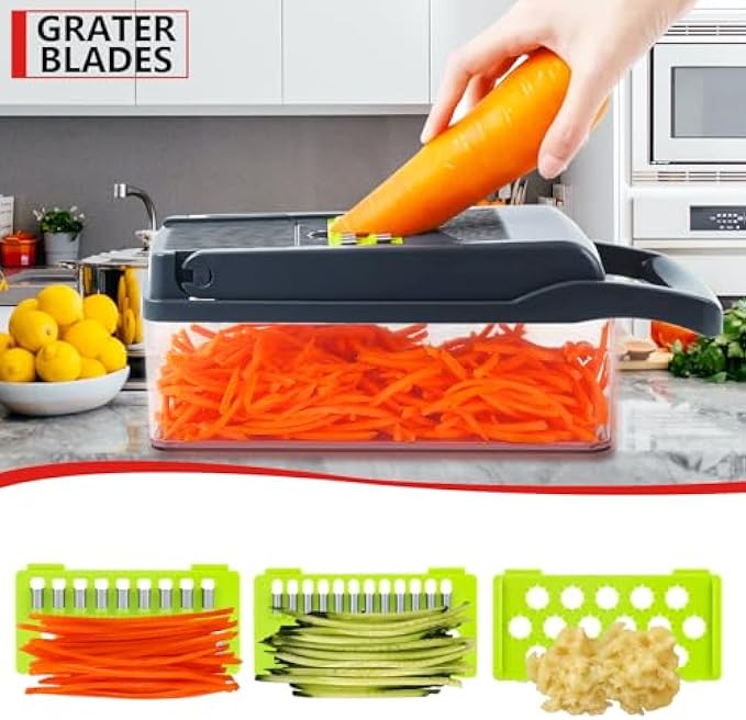 • ✔️【9 Extra Sharp Interchangeable Blades】 - When you find it, you no longer have to worry about cutting onions, potatoes, tomatoes and other vegetables. This Veggie Chopper includes two fine and a medium dicer, two slicer blades, two graters and one grinding blade. At present, we are the first buyer that added a fine blade, aim to prolong the life of the vegetable cutter, most economical and durable, help you save a lot of money.