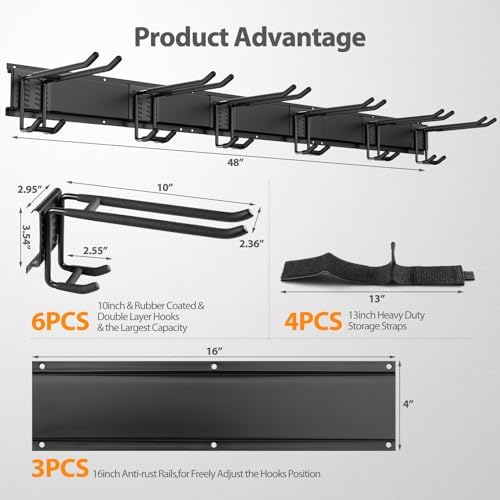 OPTIMIZE YOUR SPACE: With this 48-inch wall mount garage tool organizer, you can maximize wall space, creating more floor space for other activities. Easily locate the tools you need, whether in the garage, shed, or yard. It can hold up to 450lbs. VERSATILE WALL STORAGE SYSTEM: Our multifunctional tool storage rack accommodates a wide range of items, including garden tools, shovels, rakes, brooms, mops, extension cords, hoses, power tools, chairs, ladders, and sporting equipment. Effectively optimizing your storage space while keeping everything easily accessible and organized. MAXIMUM CAPACITY 10INCH HOOKS: This garden tool organizer comes with 6 UP-DOWM hooks, which are equivalent to 12 double hooks (6 long hooks and 6 short hooks). Additionally, the 4 storage straps allow you to neatly loop, tightly wrap, and conveniently hang cables, hoses, cords, and ropes on hooks. HEAVY DUTY GARAGE WALL ORGANIZER: Crafted from solid steel and coated with durable black powder, our wall-mounted storage system is built to last a lifetime while preventing rusting. Featuring rubber-coated double long hooks, it offers added protection against slippage and damage, ensuring your tools are securely stored and maintained in top condition. INSTALLATION GUIDE AND AFTER-SALES: Using a power drill and a level will help you quickly and easily attach it to the wall. We also provide a mounting package that includes 24 screws and 24 expansion tubes. If you have any questions regarding garage tools hanger installation, please contact us freely via email.