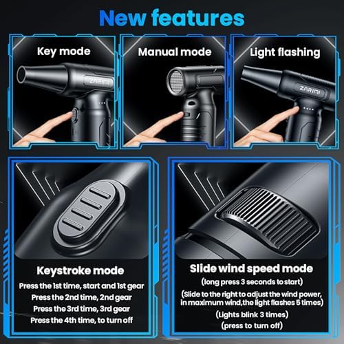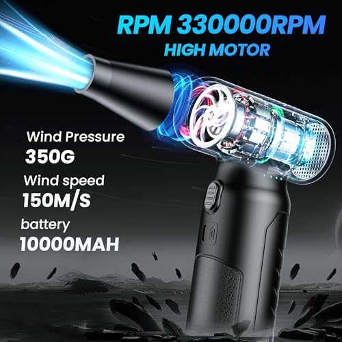 Super Power Turbo Fan【SUPER HIGH SPEED 33,0000 RPM】air dusters experience powerful cleaning with a remarkable 33,0000 RPM, Wind Pressure 350G,Wind speed:150M/. Sensuring no dust particle stands a chance! Air dusters for cleaning【 WIDE APPLICATION 】Jet-Blower ideal for various uses including PC dusting, keyboard cleaning, car cleaning kits, electric leaf blower, car detailing supplies, snow blower, jet fan, air broom and outdoor maintenance, and automobile care, making it a versatile addition to your cleaning tool kit. Mini blower【PORTABLE AND HANDHELD 】electric air duster compact design allows for easy handling and transportation; mini dusters can put it in his pockettake, this mini air blower anywhere for on-the-go cleaning. Compressed air duster aking it ideal for both indoor and outdoor use. It is also suitable for traveling and camping. Dust blower for computer 【NEW SLIDING MODE FUNCTIONAL DESIGN】Jet fan effortlessly switch between three adjustable gear settings, giving you complete control over your cleaning experience.This air blower has been upgraded, with【 button mode】 and 【sliding mode】smooth sliding, more convenient and sensitive to use. Electric air duster【SAY GOODBYE TO AIR CANNED】Compressed air duster no canned, Long-term use,say goodbye to single-use compressed air dusters; our rechargeable jet blower not only saves money but also reduces waste! Electric air duster is your ultimate cleaning companion designed to tackle dust and debris with unparalleled power and efficiency.